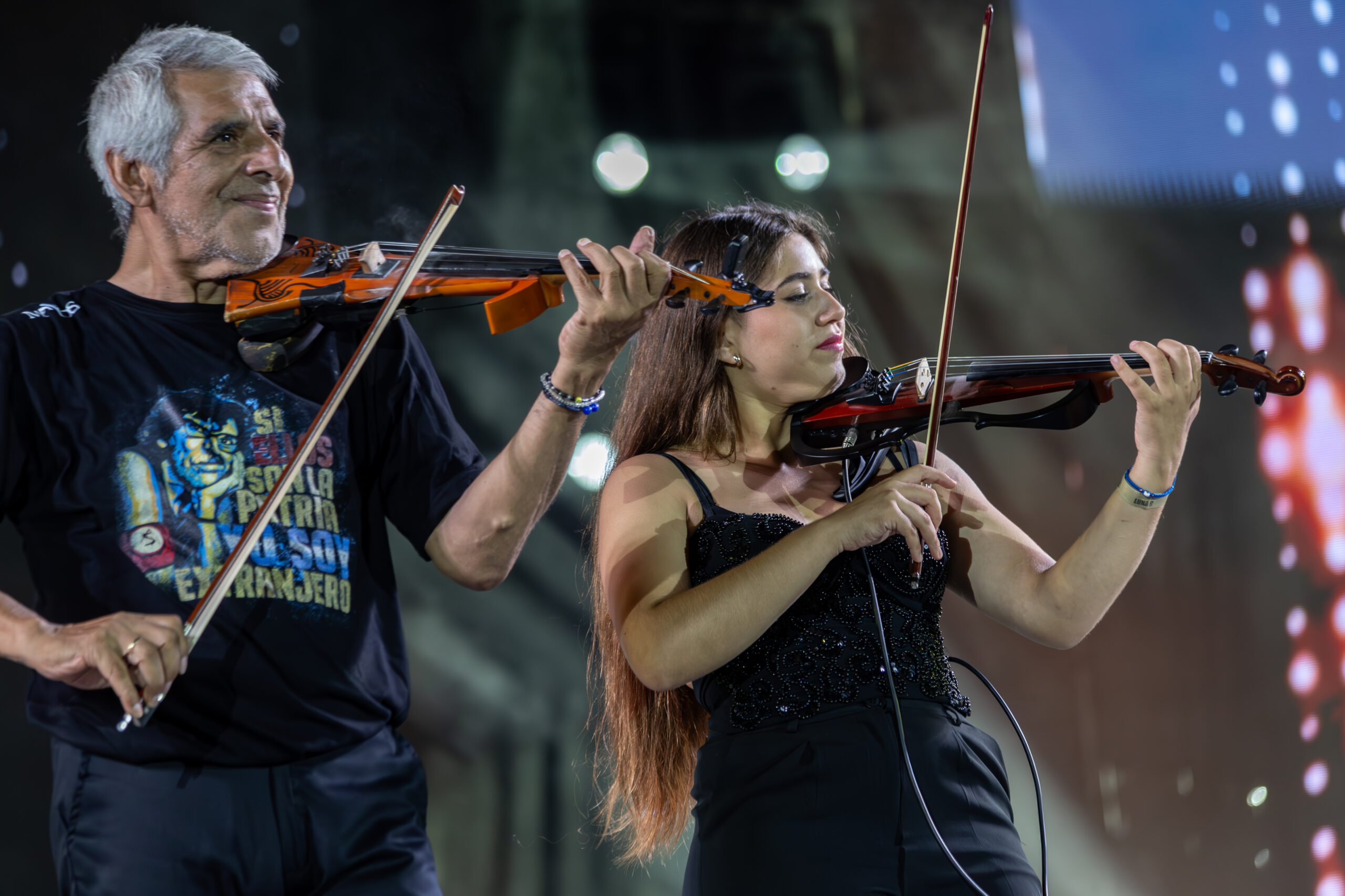 El primero en salir fue Peteco Carabajal, acompañado por Marina, Homero y su banda. Venía a mostrar un tramo de su historia. Entre el público, incluso entre jóvenes más cercanos a la música urbana que al folklore tradicional, empezó a escucharse un grito inesperado: “¡Peteco, Peteco!”. Ese coro espontáneo reveló algo que atravesó toda la edición: la tradición no está en retirada, todavía tiene con qué conquistar a nuevas generaciones. Peteco no necesitó discursos; su remera, con la cara de Charly García y la frase “si ellos son la patria, yo soy extranjero”, dijo lo que él prefirió dejar en silencio.